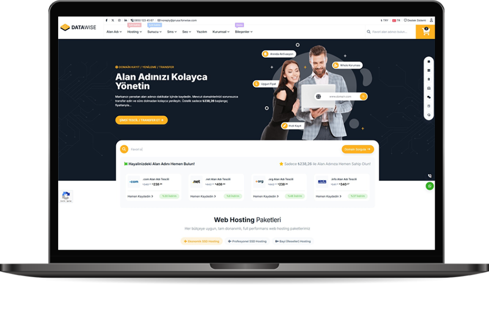 Datawise Wisecp Teması, sade ve modern çizgileriyle sektörünüz fark etmeksizin her projeye uyum sağlayacak esnek bir yapı sunar. Domain, Hosting, Server, Yazılım ve diğer hizmet sayfalarınızı, göz alıcı bir kullanıcı deneyimiyle sunabilir, profesyonel görünümüyle markanızı öne çıkarabilirsiniz.